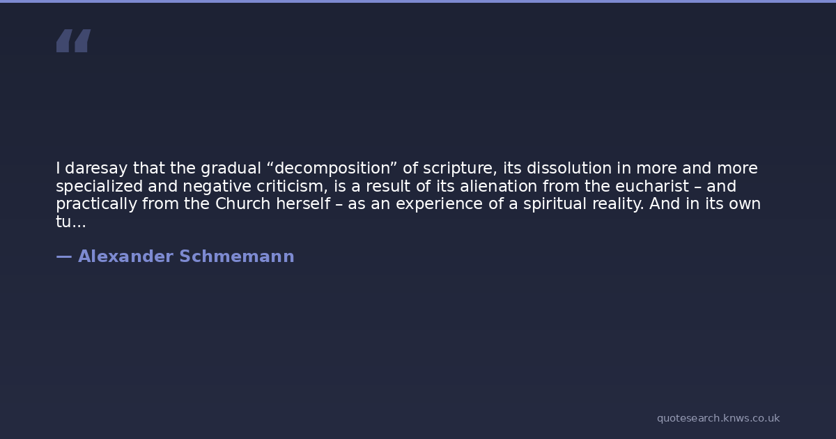 I daresay that the gradual “decomposition” of scripture, its dissolution in more and more specialized and negative criticism, is a result of its alienation from the eucharist – and practically from the Church herself – as an experience of a spiritual reality. And in its own turn, this same alienation deprived the sacrament of its evangelical content, converting it into a self-contained and self-sufficient “means of sanctification.” The scriptures and the Church are reduced here to the category of two formal *authorities*, two "sources of the faith"--as they are called in the scholastic treatises, for which the only question is which authority is the higher: which "interprets" which.As a matter of fact, by its own logic, this approach demands a further contraction, a further "reduction." For if we proclaim holy scripture to be the supreme authority for teaching the faith in the Church, then what is the “criterion” of scripture? Sooner or later it becomes “biblical science” – i.e., in the final analysis, naked reason. But if, on the other hand, we proclaim the Church to be the definitive, highest and inspired interpreter of scripture, then through whom, where and how is this interpretation brought about? And however we answer this question, this “organ” or “authority” in fact proves to be standing over the scriptures, as an *outside* authority.