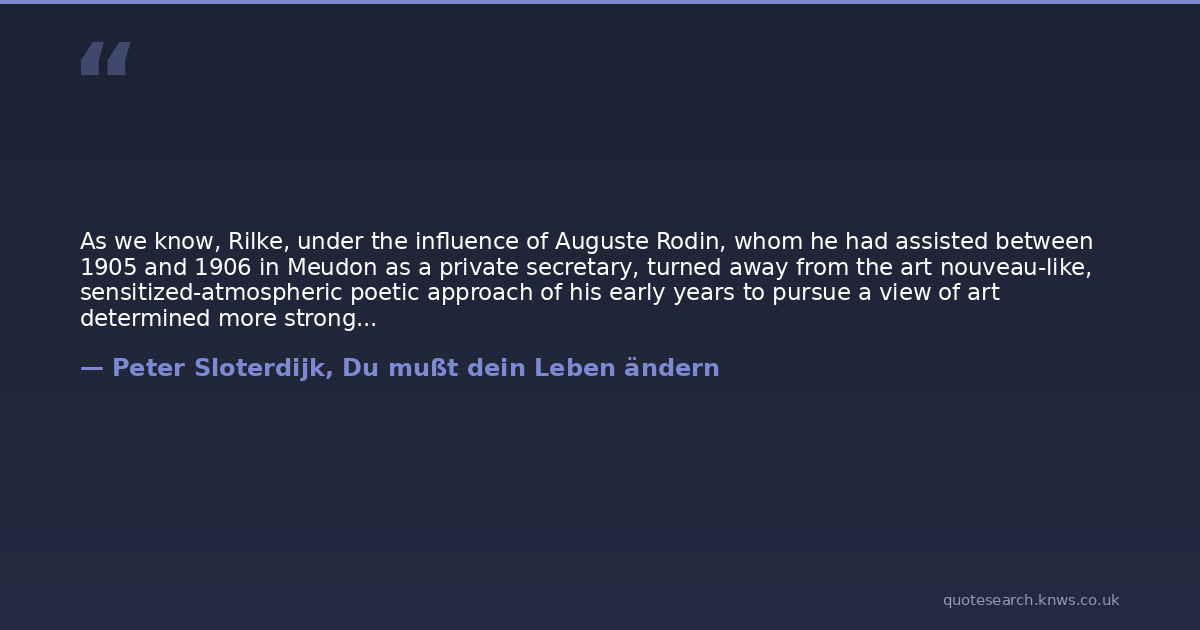 As we know, Rilke, under the influence of Auguste Rodin, whom he had assisted between 1905 and 1906 in Meudon as a private secretary, turned away from the art nouveau-like, sensitized-atmospheric poetic approach of his early years to pursue a view of art determined more strongly by the priority of the object. The proto-modern pathos of making way for the object without depicting it in a manner 'true to nature', like that of the old masters, led in Rilke's case to the concept of the thing-poem - and thus to a temporarily convincing new answer to the question of the source of aesthetic and ethical authority. From that point, it would be the things themselves from which all authority would come - or rather: from this respectively current singular thing that turns to me by demanding my full gaze. This is only possible because thing-being would now no longer mean anything but this: having something to say.