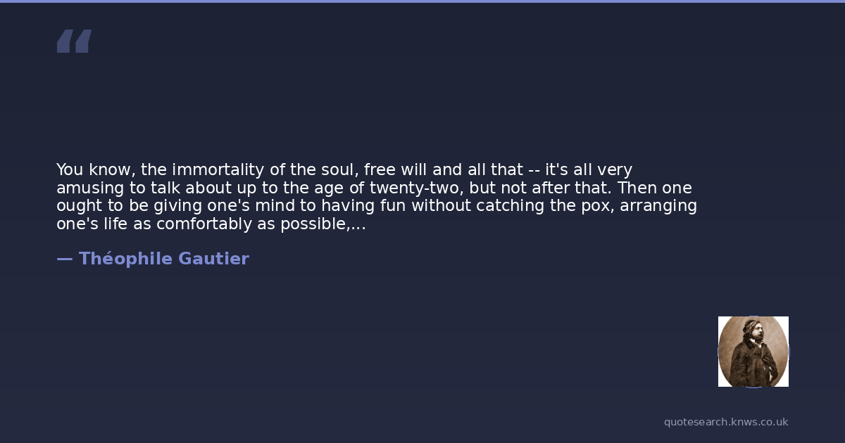 You know, the immortality of the soul, free will and all that -- it's all very amusing to talk about up to the age of twenty-two, but not after that. Then one ought to be giving one's mind to having fun without catching the pox, arranging one's life as comfortably as possible, having a few decent drawings on the wall, and above all writing well. That's the important thing: well-made sentences...and then a few metaphors. Yes, a few metaphors. They embellish a man's existence.
