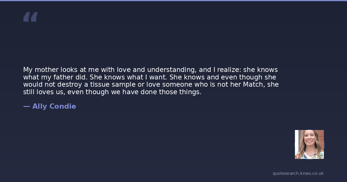 My mother looks at me with love and understanding, and I realize: she knows what my father did. She knows what I want. She knows and even though she would not destroy a tissue sample or love someone who is not her Match, she still loves us, even though we have done those things.