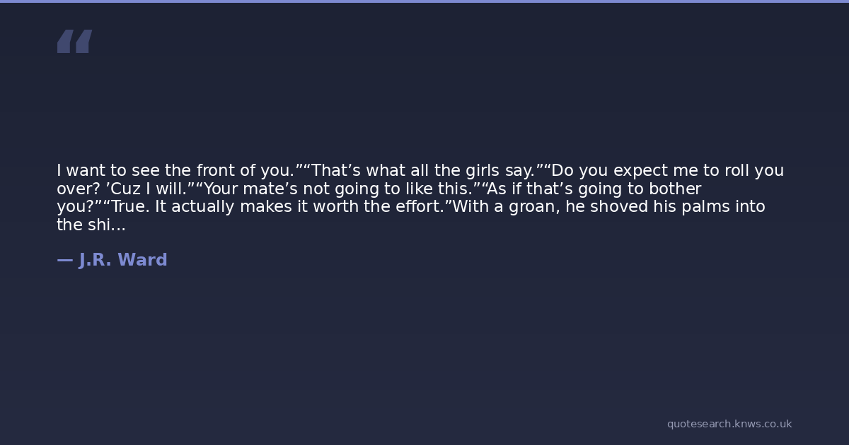 I want to see the front of you.”“That’s what all the girls say.”“Do you expect me to roll you over? ’Cuz I will.”“Your mate’s not going to like this.”“As if that’s going to bother you?”“True. It actually makes it worth the effort.”With a groan, he shoved his palms into the shimmering silver pool of blood beneath him, and flopped over like the side of beef he was.“Wow,” she breathed.“I know, right? Hung like a horse.”“If you’re really nice—and you live through this—I’ll promise not to tell V.”“About my size.”She laughed a little. “No, that you assumed I’d look at you in any fashion other than professionally.