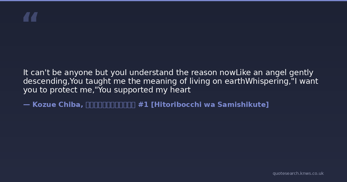 It can't be anyone but youI understand the reason nowLike an angel gently descending,You taught me the meaning of living on earthWhispering,"I want you to protect me,"You supported my heart
