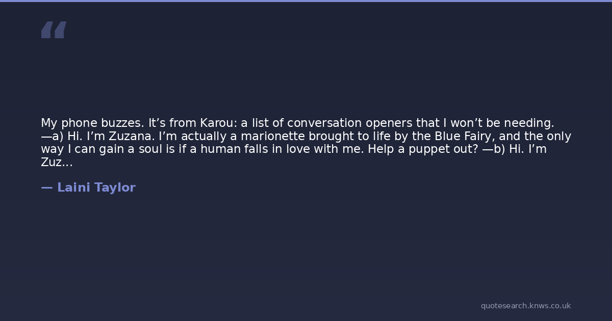 My phone buzzes. It’s from Karou: a list of conversation openers that I won’t be needing. —a) Hi. I’m Zuzana. I’m actually a marionette brought to life by the Blue Fairy, and the only way I can gain a soul is if a human falls in love with me. Help a puppet out? —b) Hi. I’m Zuzana. The touch of my lips imparts immortality. Just sayin’. —c) Hi. I’m Zuzana. I think I might like you.