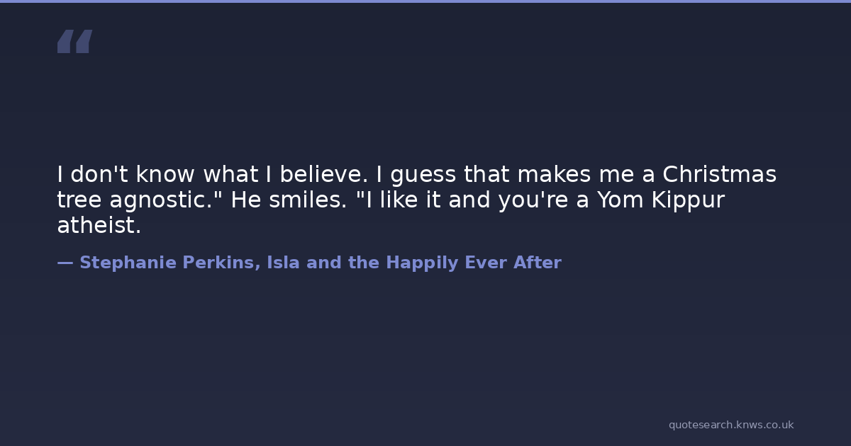 I don't know what I believe. I guess that makes me a Christmas tree agnostic." He smiles. "I like it and you're a Yom Kippur atheist.