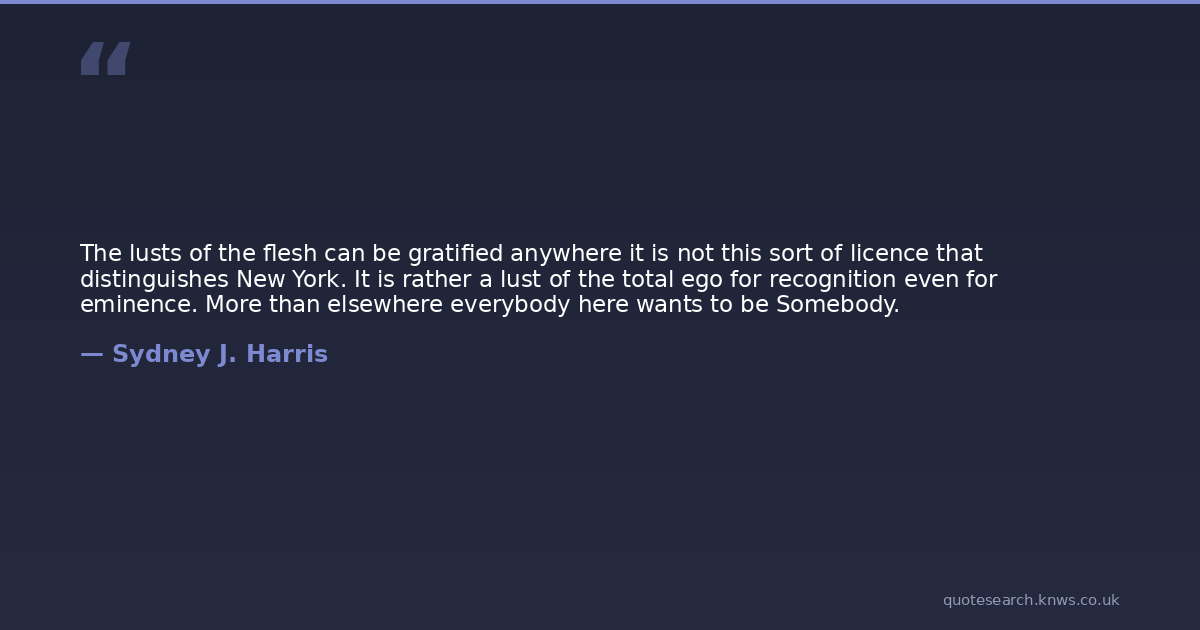 The lusts of the flesh can be gratified anywhere it is not this sort of licence that distinguishes New York. It is rather a lust of the total ego for recognition even for eminence. More than elsewhere everybody here wants to be Somebody.