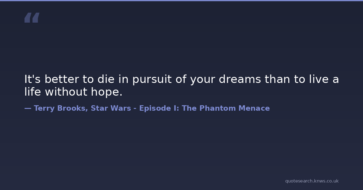 It's better to die in pursuit of your dreams than to live a life without hope. dreams phantom-menace pursuit science-fiction star-wars Download Image Share on X Share on Facebook Copy Link