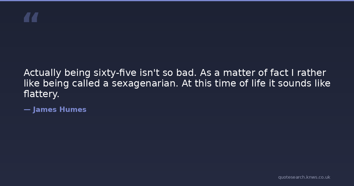 Actually being sixty-five isn't so bad. As a matter of fact I rather like being called a sexagenarian. At this time of life it sounds like flattery.