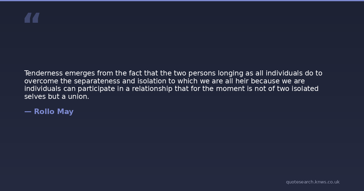 Tenderness emerges from the fact that the two persons longing as all individuals do to overcome the separateness and isolation to which we are all heir because we are individuals can participate in a relationship that for the moment is not of two isolated selves but a union.