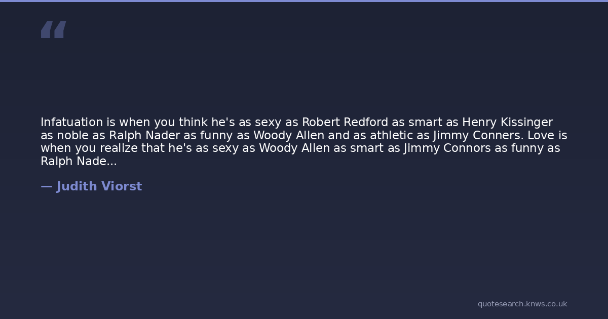 Infatuation is when you think he's as sexy as Robert Redford as smart as Henry Kissinger as noble as Ralph Nader as funny as Woody Allen and as athletic as Jimmy Conners. Love is when you realize that he's as sexy as Woody Allen as smart as Jimmy Connors as funny as Ralph Nader as athletic as Henry Kissinger and nothing like Robert Redford - but you'll take him anyway.