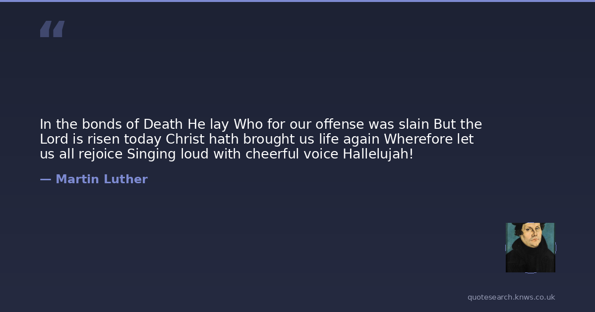 In the bonds of Death He lay Who for our offense was slain But the Lord is risen today Christ hath brought us life again Wherefore let us all rejoice Singing loud with cheerful voice Hallelujah!