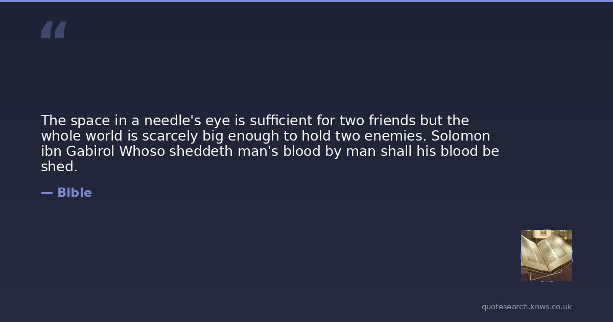 The space in a needle's eye is sufficient for two friends but the whole world is scarcely big enough to hold two enemies. Solomon ibn Gabirol Whoso sheddeth man's blood by man shall his blood be shed.