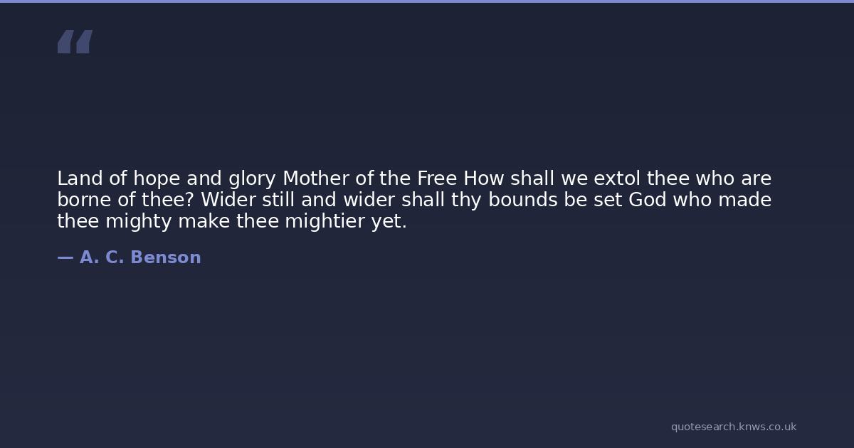 Land of hope and glory Mother of the Free How shall we extol thee who are borne of thee? Wider still and wider shall thy bounds be set God who made thee mighty make thee mightier yet.