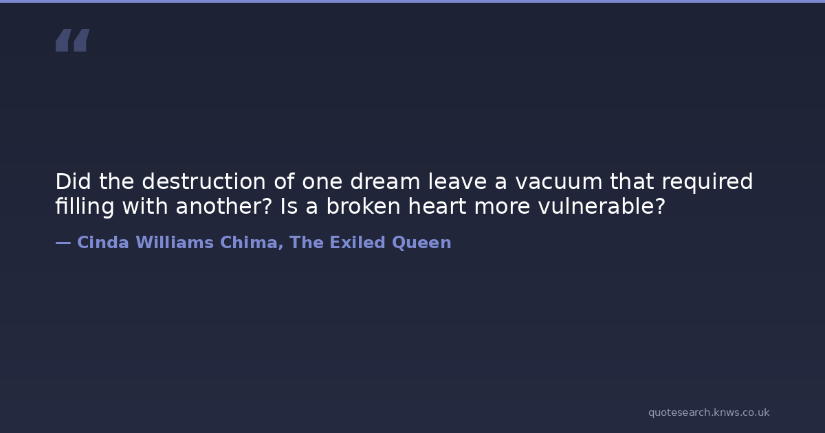 Did the destruction of one dream leave a vacuum that required filling with another? Is a broken heart more vulnerable?