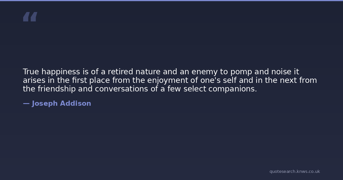 True happiness is of a retired nature and an enemy to pomp and noise it arises in the first place from the enjoyment of one's self and in the next from the friendship and conversations of a few select companions.