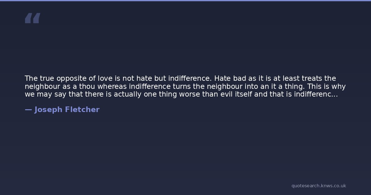 The true opposite of love is not hate but indifference. Hate bad as it is at least treats the neighbour as a thou whereas indifference turns the neighbour into an it a thing. This is why we may say that there is actually one thing worse than evil itself and that is indifference to evil. In human relations the nadir of morality the lowest point as far as Christian ethics is concerned is manifest in the phrase T couldn't care less.'