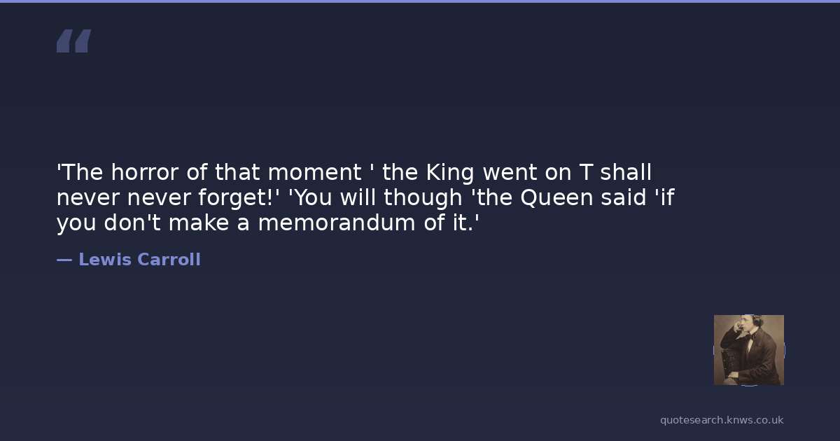'The horror of that moment ' the King went on T shall never never forget!' 'You will though 'the Queen said 'if you don't make a memorandum of it.'