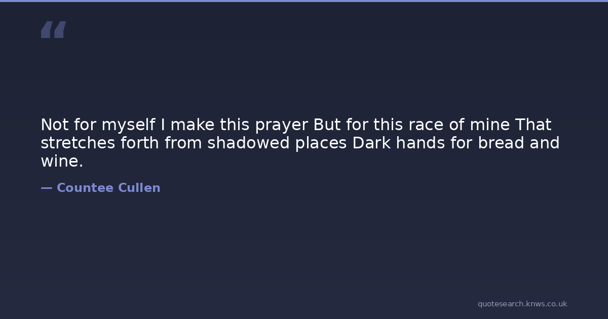Not for myself I make this prayer But for this race of mine That stretches forth from shadowed places Dark hands for bread and wine.