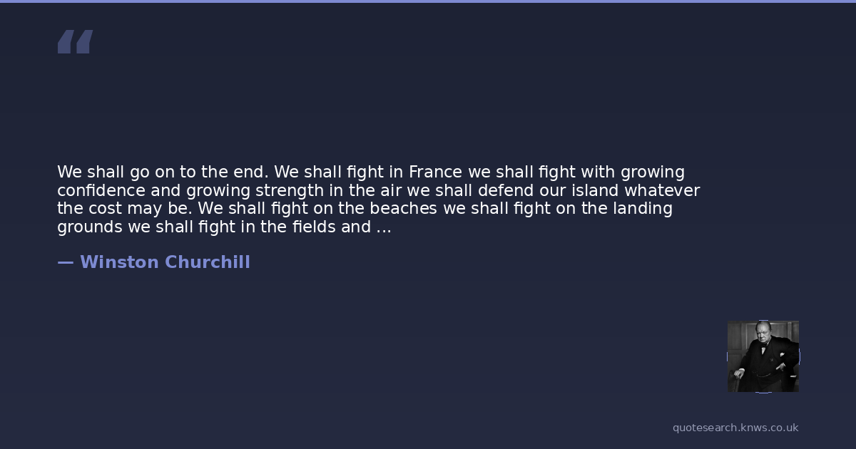 We shall go on to the end. We shall fight in France we shall fight with growing confidence and growing strength in the air we shall defend our island whatever the cost may be. We shall fight on the beaches we shall fight on the landing grounds we shall fight in the fields and in the streets we shall fight in the halls. We shall never surrender.