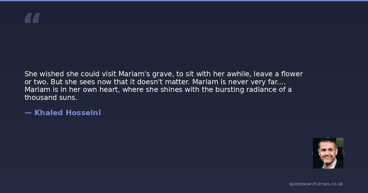 She wished she could visit Mariam's grave, to sit with her awhile, leave a flower or two. But she sees now that it doesn't matter. Mariam is never very far.... Mariam is in her own heart, where she shines with the bursting radiance of a thousand suns.