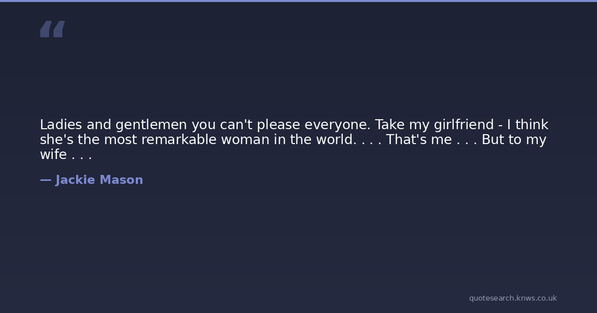 Ladies and gentlemen you can't please everyone. Take my girlfriend - I think she's the most remarkable woman in the world. . . . That's me . . . But to my wife . . .