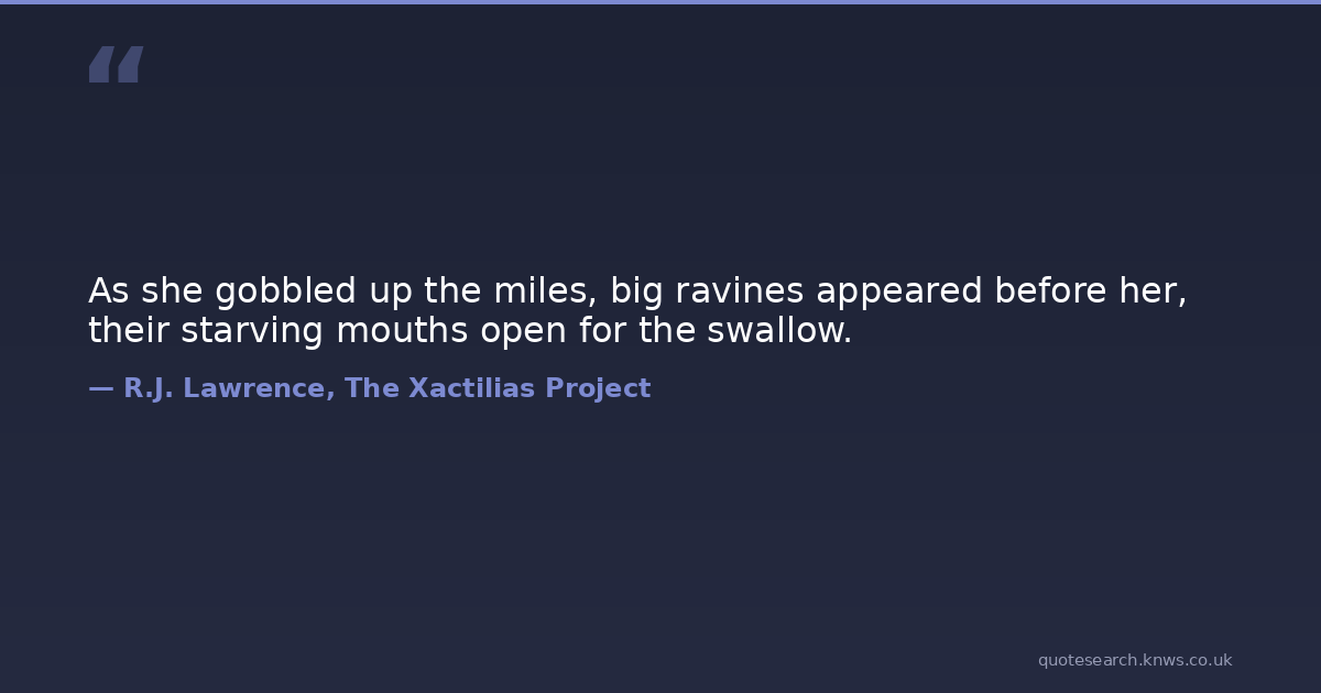As she gobbled up the miles, big ravines appeared before her, their starving mouths open for the swallow. flying flying-quotes landscape prose Download Image Share on X Share on Facebook Copy Link