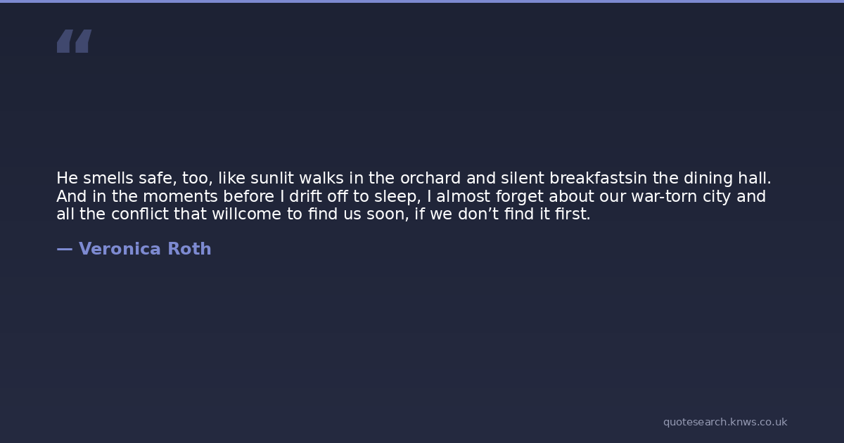He smells safe, too, like sunlit walks in the orchard and silent breakfastsin the dining hall. And in the moments before I drift off to sleep, I almost forget about our war-torn city and all the conflict that willcome to find us soon, if we don’t find it first.