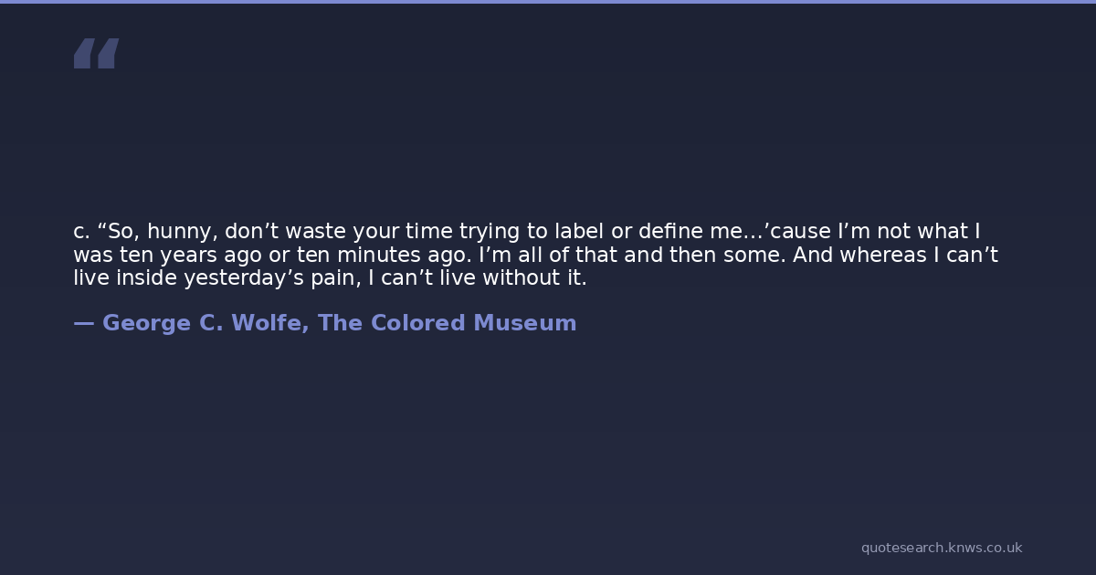 c. “So, hunny, don’t waste your time trying to label or define me…’cause I’m not what I was ten years ago or ten minutes ago. I’m all of that and then some. And whereas I can’t live inside yesterday’s pain, I can’t live without it.