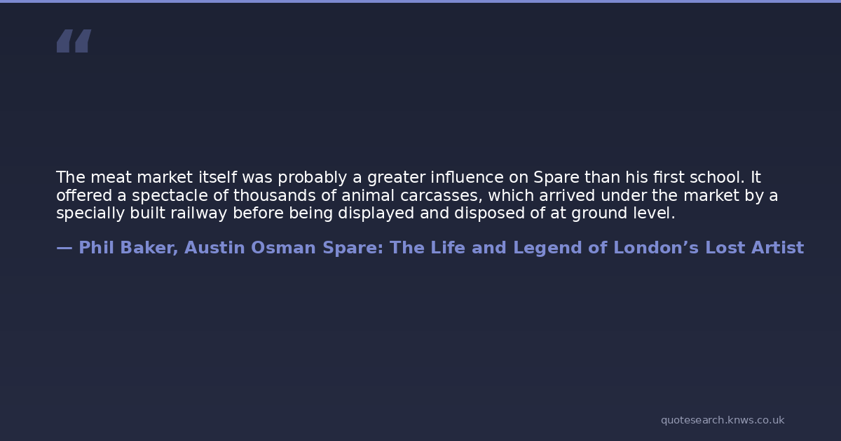 The meat market itself was probably a greater influence on Spare than his first school. It offered a spectacle of thousands of animal carcasses, which arrived under the market by a specially built railway before being displayed and disposed of at ground level.