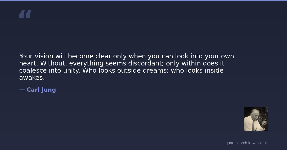 Your vision will become clear only when you can look into your own heart. Without, everything seems discordant; only within does it coalesce into unity. Who looks outside dreams; who looks inside awakes.