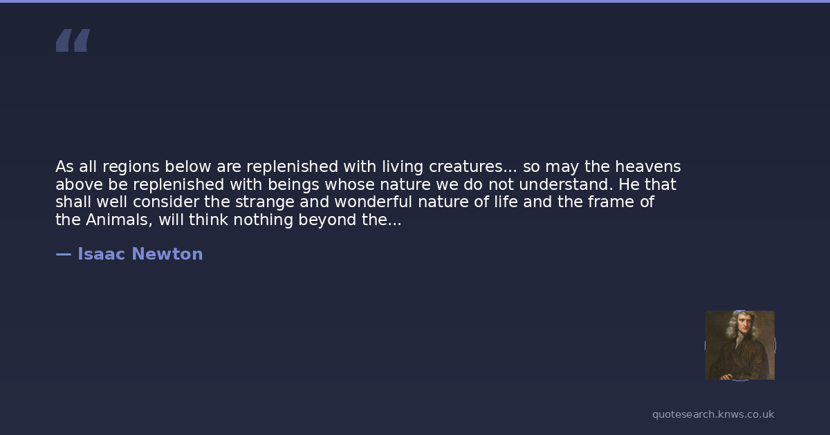 As all regions below are replenished with living creatures... so may the heavens above be replenished with beings whose nature we do not understand. He that shall well consider the strange and wonderful nature of life and the frame of the Animals, will think nothing beyond the possibility of nature, nothing too hard for the omnipotent power of God. And as the Planets remain in their orbs, so may any other bodies subsist at any distance from the earth, and much more may beings, who have sufficient power of self motion, move whether they will, and continue in any regions of the heavens whatever, there to enjoy the society of one another, and by their messengers or Angels to rule the earth and convers with the remotest regions. Thus may the whole heavens or any part thereof whatever be the habitation of the Blessed, and at the same time the earth be subject to their dominion. And to have thus the liberty and dominion of the whole heavens and the choice of the happiest places for abode seems a greater happiness than to be confined to any one place whatever.