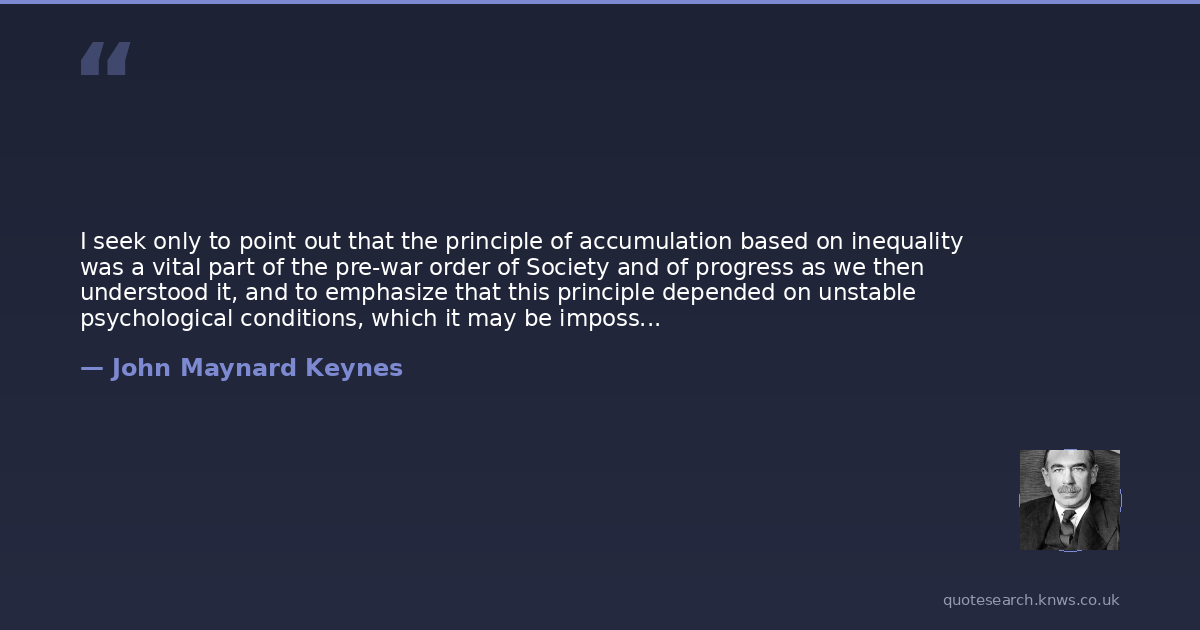 I seek only to point out that the principle of accumulation based on inequality was a vital part of the pre-war order of Society and of progress as we then understood it, and to emphasize that this principle depended on unstable psychological conditions, which it may be impossible to recreate. It was not natural for a population, of whom so few enjoyed the comforts of life, to accumulate so hugely. The war has disclosed the possibility of consumption to all and the vanity of abstinence to many. Thus the bluff is discovered; the labouring classes may be no longer willing to forgo so largely, and the capitalist classes, no longer confident of the future, may seek to enjoy more fully their liberties of consumption so long as they last, and thus precipitate the hour of their confiscation.