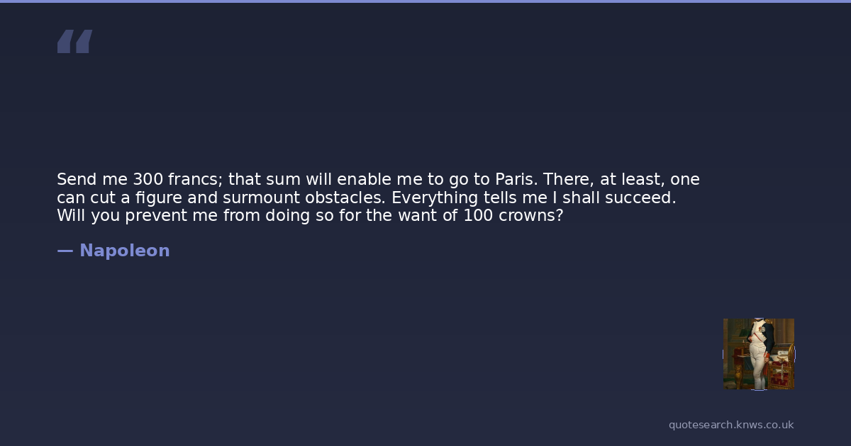 Send me 300 francs; that sum will enable me to go to Paris. There, at least, one can cut a figure and surmount obstacles. Everything tells me I shall succeed. Will you prevent me from doing so for the want of 100 crowns?