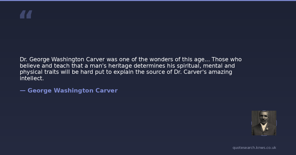 Dr. George Washington Carver was one of the wonders of this age... Those who believe and teach that a man's heritage determines his spiritual, mental and physical traits will be hard put to explain the source of Dr. Carver's amazing intellect.