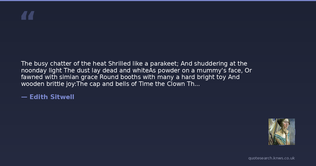 The busy chatter of the heat Shrilled like a parakeet; And shuddering at the noonday light The dust lay dead and whiteAs powder on a mummy's face, Or fawned with simian grace Round booths with many a hard bright toy And wooden brittle joy:The cap and bells of Time the Clown That, jangling, whistled down Young cherubs hidden in the guise Of every bird that flies;And star-bright masks for youth to wear, Lest any dream that fare — Bright pilgrim — past our ken, should see Hints of Reality.