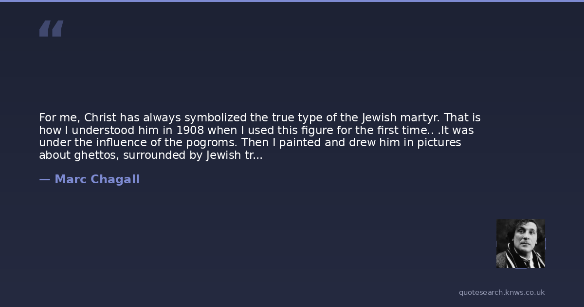 For me, Christ has always symbolized the true type of the Jewish martyr. That is how I understood him in 1908 when I used this figure for the first time.. .It was under the influence of the pogroms. Then I painted and drew him in pictures about ghettos, surrounded by Jewish troubles, by Jewish mothers, running terrified with little children in their arms.
