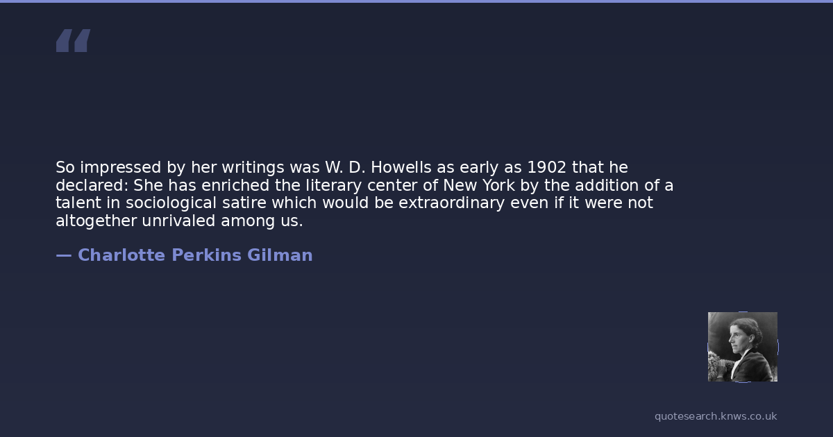 So impressed by her writings was W. D. Howells as early as 1902 that he declared: She has enriched the literary center of New York by the addition of a talent in sociological satire which would be extraordinary even if it were not altogether unrivaled among us.