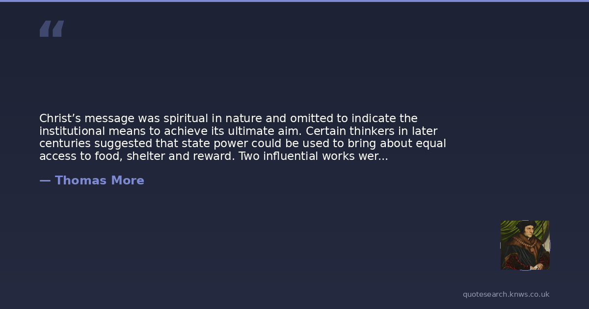 Christ’s message was spiritual in nature and omitted to indicate the institutional means to achieve its ultimate aim. Certain thinkers in later centuries suggested that state power could be used to bring about equal access to food, shelter and reward. Two influential works were Thomas More’s Utopia in 1516 and Tomaso Campanella’s City of the Sun in 1601. More could not imagine that the common man, still less the common woman, might independently attain the perfection of society without order from above.
