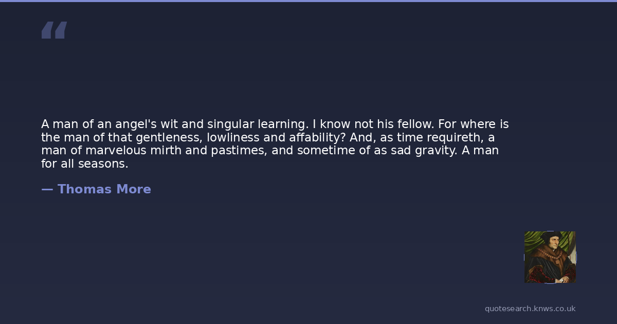 A man of an angel's wit and singular learning. I know not his fellow. For where is the man of that gentleness, lowliness and affability? And, as time requireth, a man of marvelous mirth and pastimes, and sometime of as sad gravity. A man for all seasons.