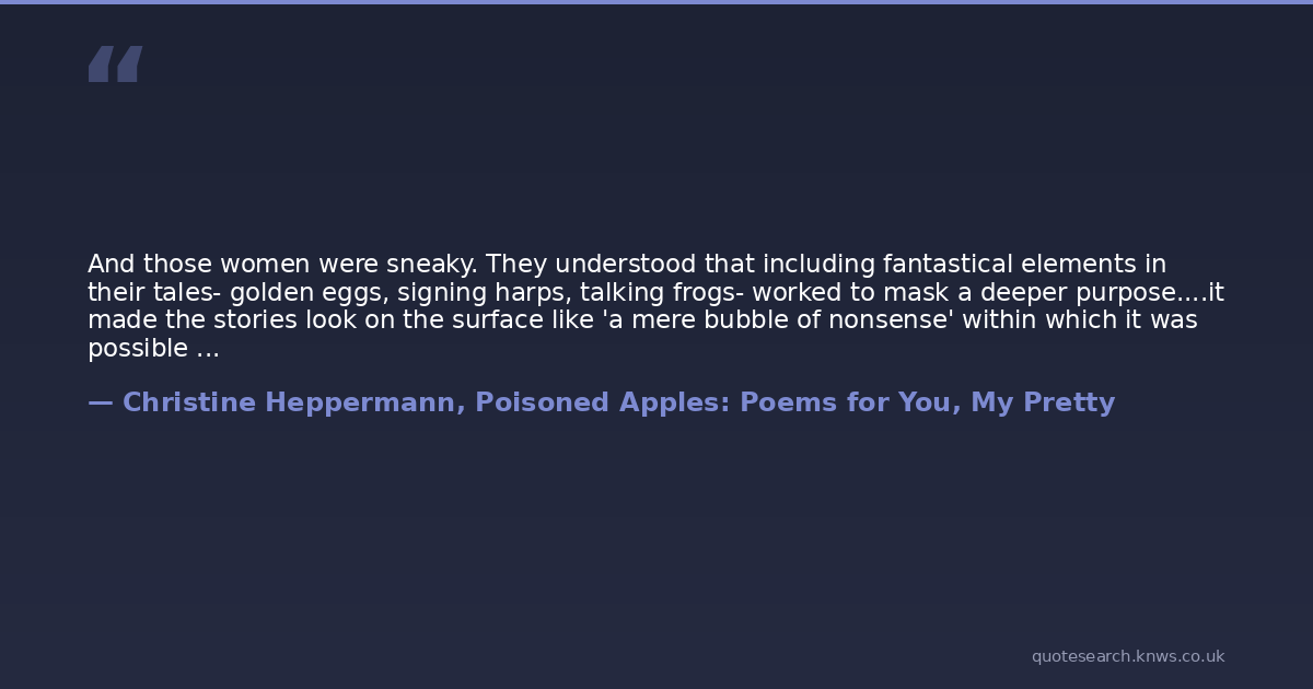 And those women were sneaky. They understood that including fantastical elements in their tales- golden eggs, signing harps, talking frogs- worked to mask a deeper purpose....it made the stories look on the surface like 'a mere bubble of nonsense' within which it was possible to 'utter harsh truths, to say what you dare' about the state of women's lives. Because they were just stories, right? Harmless little fantasies?