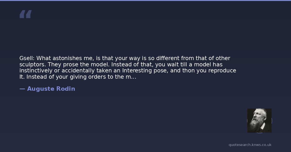Gsell: What astonishes me, is that your way is so different from that of other sculptors. They prose the model. Instead of that, you wait till a model has instinctively or accidentally taken an Interesting pose, and thon you reproduce It. Instead of your giving orders to the model, the model gives orders to you.