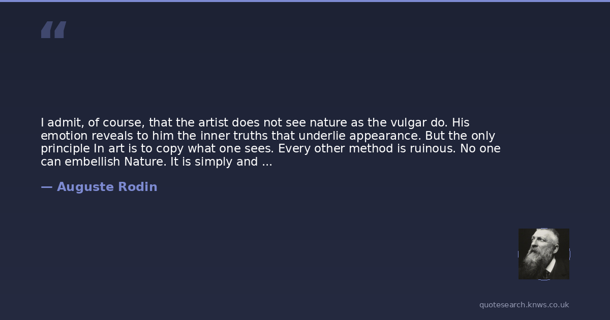 I admit, of course, that the artist does not see nature as the vulgar do. His emotion reveals to him the inner truths that underlie appearance. But the only principle In art is to copy what one sees. Every other method is ruinous. No one can embellish Nature. It is simply and solely a question of seeing. Doubtless a mediocre man, when he copies will never produce a work of art. He looks without seeing. No matter how minutely he observes, the result will be flat and without character. But the artist's trade is not for mediocre men, and no amount of training can supply them with talent. The artist sees - he sees with his heart. He sees deep into the heart of Nature. To the artist everything in Nature is beautiful.The vulgarian imagines that what looks to him ugly In Nature is not material for the artist. He would forbid us to represent what displeases and offends him. He makes a grave mistake. What is commonly called ugliness in Nature may become a great beauty in art.In the realm of realities, people regard as ugly everything that is deformed and diseased and that suggests sickness, weakness and suffering. They regard as ugly everything that defies regularity, which is to them the symbol and condition of health and strength. A hump is ugly, bow-legs are ugly, misery in rags is ugly. Ugly, again, are the soul and conduct of the immoral, the vicious, the criminal man, the abnormal man who is an enemy of society; ugly is the soul of the parricide, the traitor, the unscrupulous slave of ambition. And it is right that the lives and the of which we can expect only evil should be given an odious epithet.