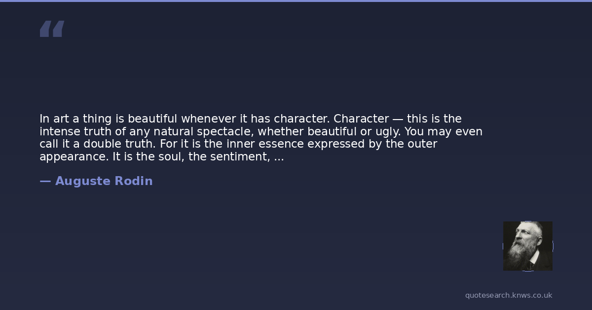 In art a thing is beautiful whenever it has character. Character — this is the intense truth of any natural spectacle, whether beautiful or ugly. You may even call it a double truth. For it is the inner essence expressed by the outer appearance. It is the soul, the sentiment, the idea that shines out through the features of a fare, the pose and action of a human body, the tones of a skym the line of a horizon.