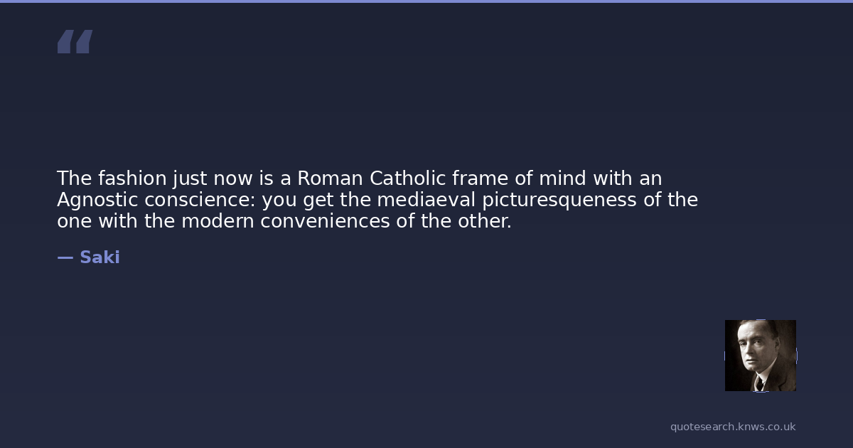 The fashion just now is a Roman Catholic frame of mind with an Agnostic conscience: you get the mediaeval picturesqueness of the one with the modern conveniences of the other.