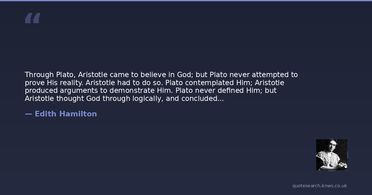 Through Plato, Aristotle came to believe in God; but Plato never attempted to prove His reality. Aristotle had to do so. Plato contemplated Him; Aristotle produced arguments to demonstrate Him. Plato never defined Him; but Aristotle thought God through logically, and concluded with entire satisfaction to himself that He was the Unmoved Mover.