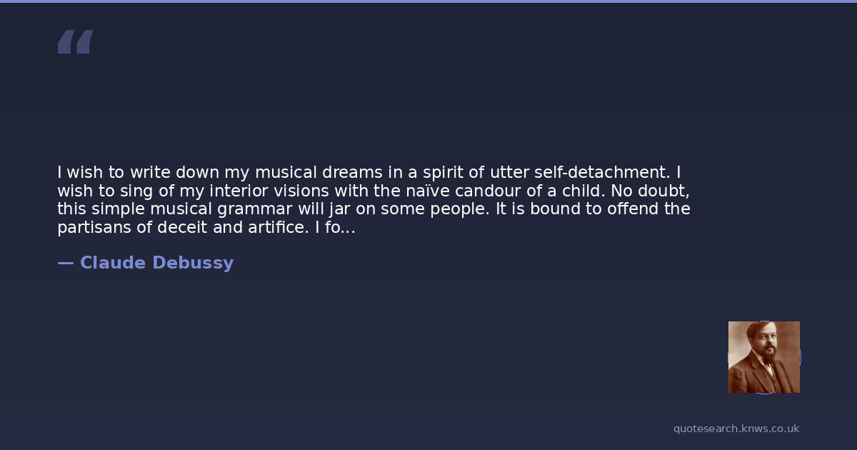 I wish to write down my musical dreams in a spirit of utter self-detachment. I wish to sing of my interior visions with the naïve candour of a child. No doubt, this simple musical grammar will jar on some people. It is bound to offend the partisans of deceit and artifice. I foresee that and rejoice at it. I shall do nothing to create adversaries, but neither shall I do anything to turn enmities into friendships. I must endeavour to be a great artist so that I may dare to be myself and suffer for my faith. Those who feel as I do will only appreciate me more. The others will shun and hate me. I shall make no effort to appease them. On that distant day — I trust it is still very far off — when I shall no longer be a cause of strife, I shall feel bitter self-reproach. For that odious hypocrisy which enables one to please all mankind will inevitably have prevailed in those last works.