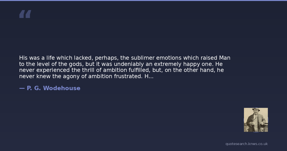 His was a life which lacked, perhaps, the sublimer emotions which raised Man to the level of the gods, but it was undeniably an extremely happy one. He never experienced the thrill of ambition fulfilled, but, on the other hand, he never knew the agony of ambition frustrated. His name, when he died, would not live for ever in England's annals; he was spared the pain of worrying about this by the fact that he had no desire to live for ever in England's annals. He was possibly as nearly contented a human being can be in this century of alarms and excursions.