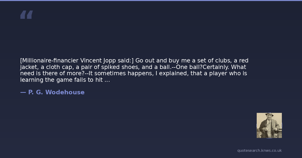 [Millionaire-financier Vincent Jopp said:] Go out and buy me a set of clubs, a red jacket, a cloth cap, a pair of spiked shoes, and a ball.--One ball?Certainly. What need is there of more?--It sometimes happens, I explained, that a player who is learning the game fails to hit the ball straight, and then he often loses it in the rough at the side of the fairway.Absurd! said Vincent Jopp. If I set out to drive my ball straight, I shall drive it straight.