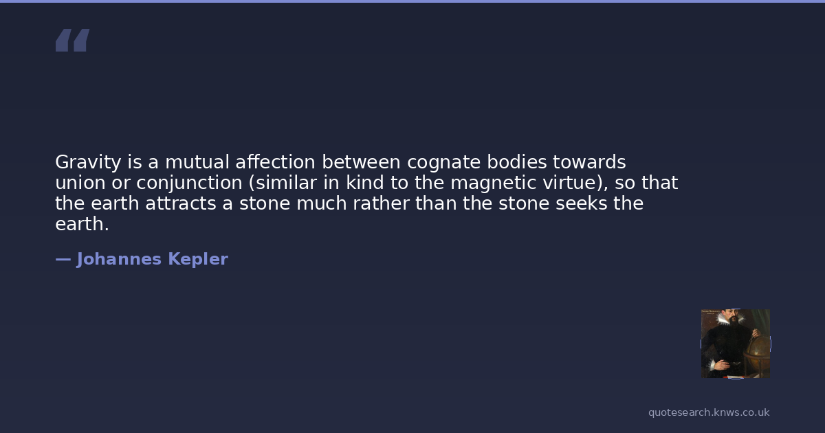 Gravity is a mutual affection between cognate bodies towards union or conjunction (similar in kind to the magnetic virtue), so that the earth attracts a stone much rather than the stone seeks the earth.