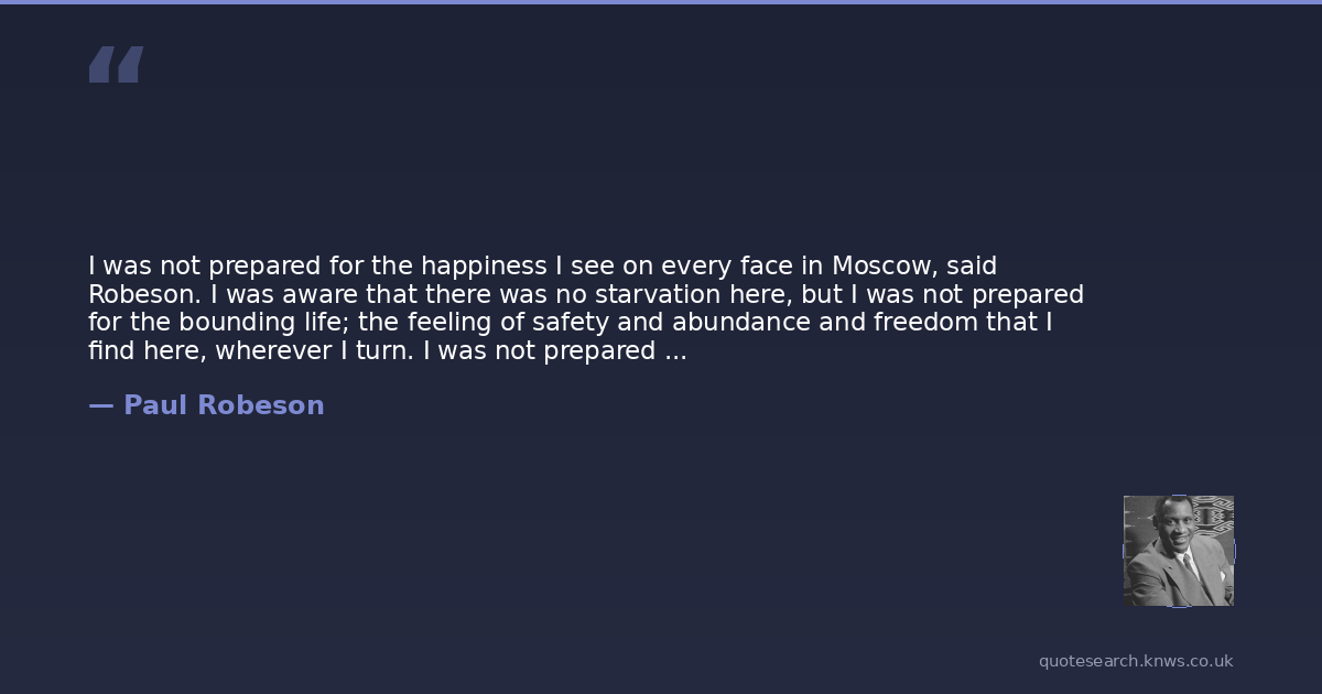 I was not prepared for the happiness I see on every face in Moscow, said Robeson. I was aware that there was no starvation here, but I was not prepared for the bounding life; the feeling of safety and abundance and freedom that I find here, wherever I turn. I was not prepared for the endless friendliness, which surrounded me from the moment I crossed the border. I had a technically irregular passport, but all this was brushed aside by the eager helpfulness of the border authorities. And this joy and happiness and friendliness, this utter absence of any embarrassment over a ‘race question’ is all the more keenly felt by me because of the day I spent in Berlin on the way here, and that was a day of horror—in an atmosphere of hatred, fear and suspicion.