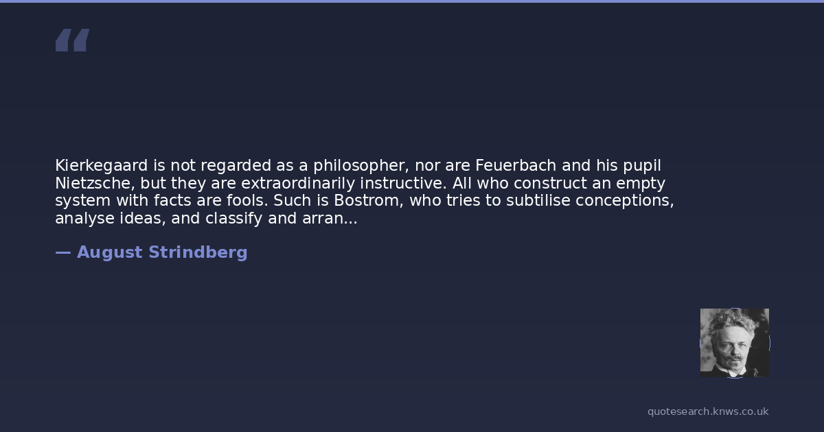 Kierkegaard is not regarded as a philosopher, nor are Feuerbach and his pupil Nietzsche, but they are extraordinarily instructive. All who construct an empty system with facts are fools. Such is Bostrom, who tries to subtilise conceptions, analyse ideas, and classify and arrange God, man, and human life under heads.